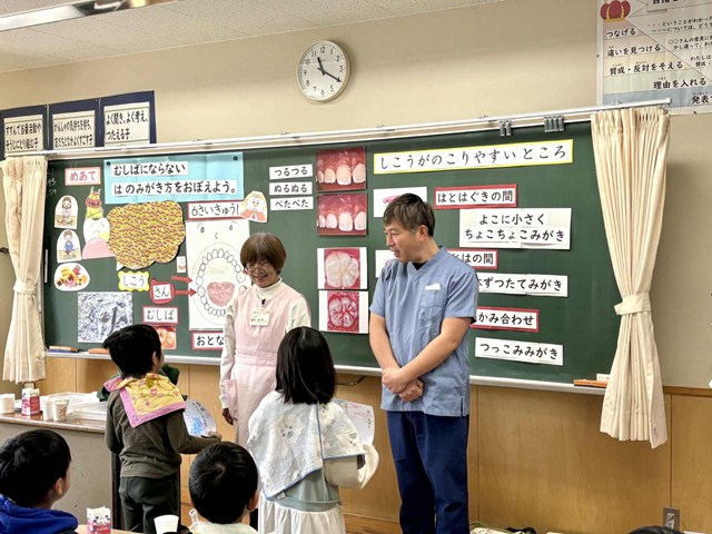 さて先日、院長が小学校へ歯磨き指導に行ってきました! 目をキラキラ輝かせながら、歯磨きの大事さや虫歯の成り立ちなどを聞いてくれ、お互いにすごく充実した時間になったようです(^^) 今ある歯を生涯使っていけるように、患者のみなさんも、これからも歯磨きを頑張っていきましょう!